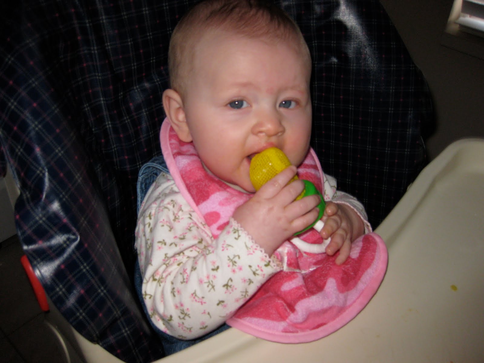 I have been making my own baby food and then freezing it in ice cube trays. Jade loves it when we put one of those ice cubes in her little mesh popsicle bag and then she bites and licks it til it's gone. Her favorite is squash!