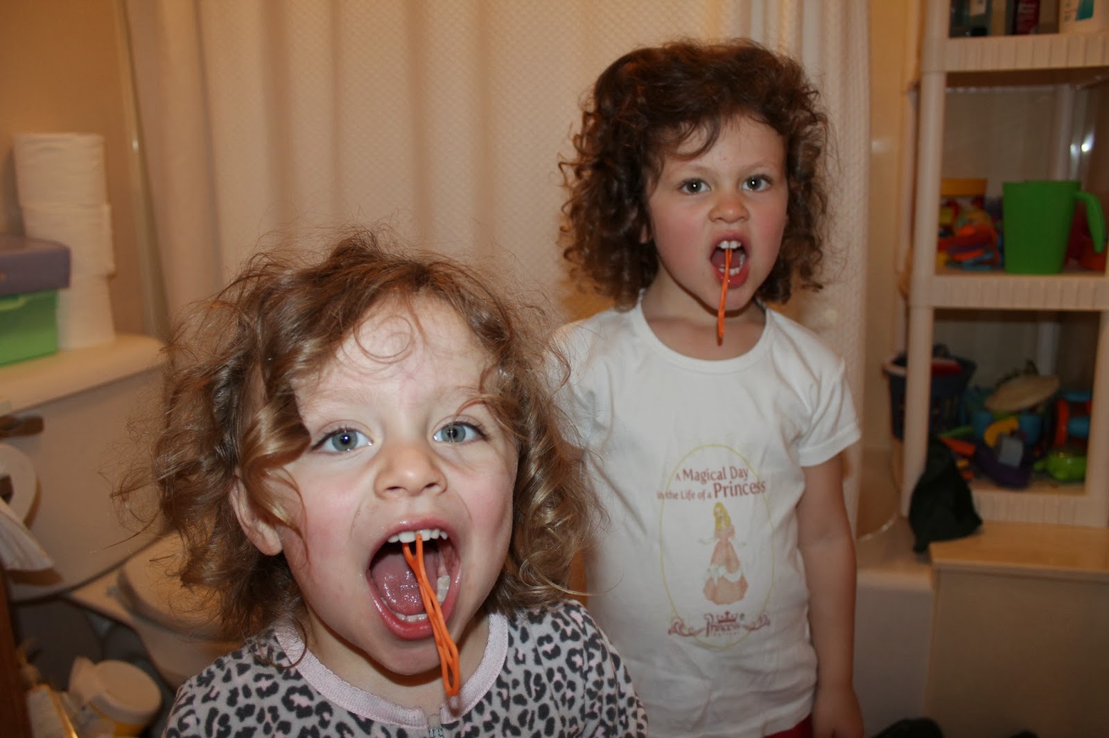 My silly girls showing off their floss and declaring how very cool they were that they could get their floss to hang between their 2 front teeth!